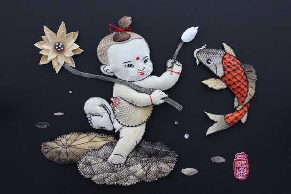 鱼皮画是赫哲族的传统艺术,曾被称为无纸剪纸,通过对鱼皮的剪切、粘贴和镂刻,就能创作出让人叫绝的精美图画。 具有观赏、收藏、传承价值的鱼皮画,制作过程比较复杂。“首先要把画有创作题材的画纸剪下,并拓印在纸板上。然后按照纸板上画的形状,剪出同样形状的鱼皮。最后将裁剪好的鱼皮贴在背纸板上,着色装裱。