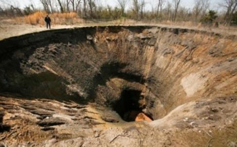 长年开采锌矿和铅矿让俄克拉荷马州与堪萨斯州交界附近皮谢尔的地面布满陷坑,包括2008年所拍照片中的这个陷坑。一些矿在挖掘过程中距离地面太近,顶部无法支撑上方土壤的重量,最终导致塌陷。密苏里州的格乌泽说:“密苏里州和宾夕法尼亚州西部的煤矿附近也曾出现过陷坑。我们的建矿技术越来越高,顶部足以支撑上方土壤的重量。”