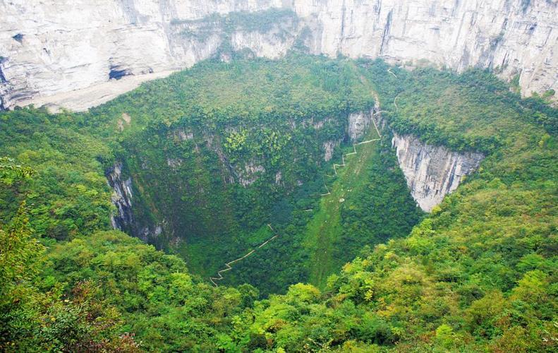 奉节小寨天坑位于重庆市奉节县兴隆镇小寨村,坑口地面标高1331米,深666.2米,坑口直径622米,坑底直径522米,是目前世界上发现的最大的“漏斗”。被国家建设部入选为首批《中国国家自然遗产、国家自然与文化双遗产预备名录》。