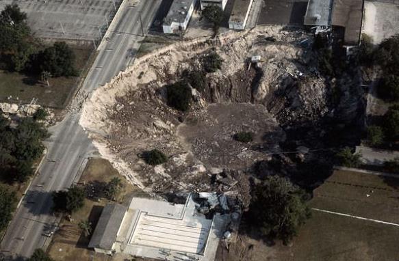 深约185英尺(约合56米)的天坑于1994年出现在佛罗里达州的马尔伯里市,发生塌陷的地方位于采矿企业IMC-Agrico倾倒的一堆废料。该公司当时正在开采岩石以提取磷酸盐。磷酸盐是一种化学物质,是化肥的主要成分,主要用于制造磷酸,以及增强苏打和各种食品的味道。然而,在磷酸盐从岩石中提取出来以后,主要成分是石膏的废料被作为泥浆过滤出来。