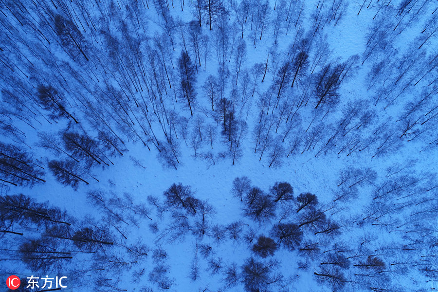 内蒙古呼伦贝尔林区地理风光,冬季树林雪景。