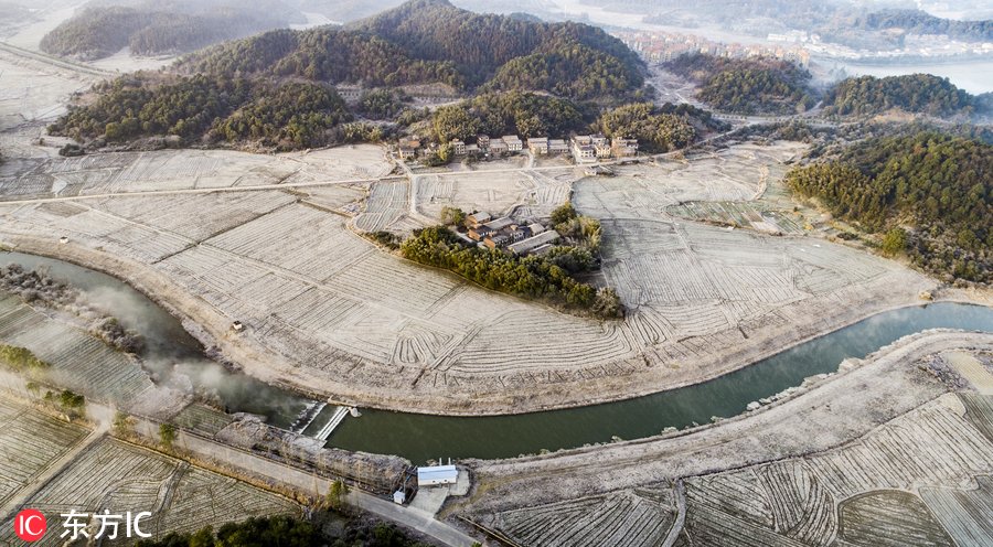 受连日来低温天气影响,jrs电脑直播_极速体育无插件直播_jrs直播极速体育下的江西新余市仙女湖区河下镇乡村被霜降覆盖,宛如雪景。霜冻、村庄、河流、山林等在阳光照耀下共同构成一道冬日奇观。