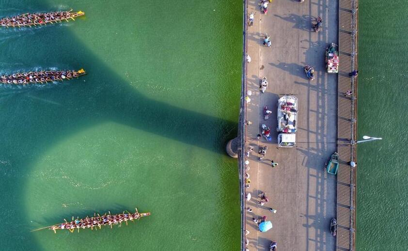 夕阳的映照下,龙舟竞相穿越过碧绿河水上的洎阳大桥,与河中裸露出的“绿岛”形成一道美景。