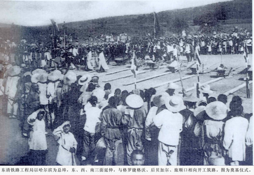 东清铁路工程局以哈尔滨为总埠。东、西、南三面延伸。与格罗捷格活。后贝加尔、旅顺口相向开工筑路。图为奠基仪式。