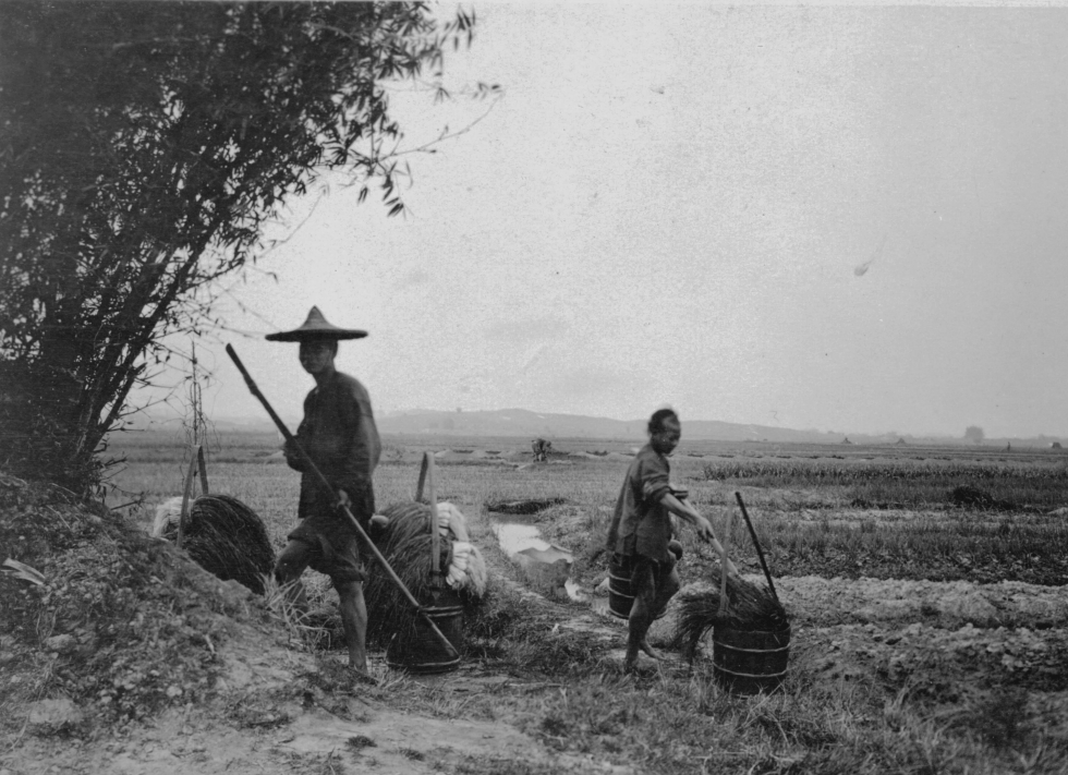 图为在农田劳作的人。看起来像是父子俩。摄于1909年。张柏林拍摄