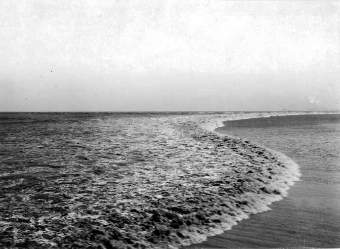以上三幅图拍摄了浙江潮从远及近的过程。近代史上诞生了一本着名刊物《浙江潮》,1903年2月17日在日本东京创刊。由中国留日学生浙江同乡会主办,孙翼中、蒋方震、马君武、蒋智由、王嘉榘等任编辑。以“输入文明”,“发其雄心”,“养其气魄”,“汹涌革命潮”为主旨,设有社说、论说、学说、大势等栏目。宣传反清的民族革命思想,揭露帝国主义对中国的侵略,批判改良派的“和平立宪”主张,鼓吹“革命造反”。