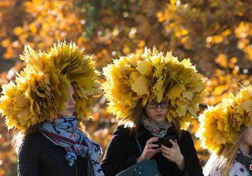 俄罗斯莫斯科,市民在公园中戴着用秋叶做成的帽子。