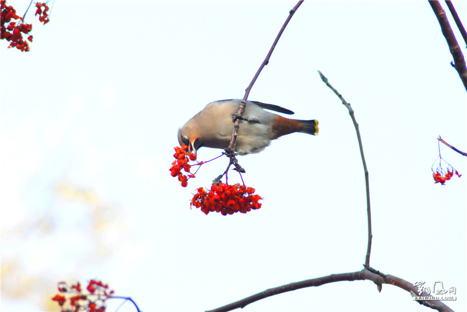 在佳木斯西林公园内有一种鸟类长年在此栖息,它就是太平鸟。太平鸟(学名:Bombycilla garrulus)为鸟纲太平鸟科的鸟类。体长18厘米,翼展34-35厘米,体重40-64克,寿命13年。全身基本上呈葡萄灰褐色,头部色深呈栗褐色,头顶有一细长呈簇状的羽冠,一条黑色贯眼纹从嘴基经眼到后枕,位于羽冠两侧,在栗褐色的头部极为醒目。颏、喉黑色。翅具白色翼斑,次级飞羽羽干末端具红色滴状斑。尾具黑色次端斑和黄色端斑。拍摄这组镜头那日阴天,散色光拍摄出来的效果另一翻的格调。鸟儿身后的背景白色和蓝色勾勒出似国画的效果,美不胜收。