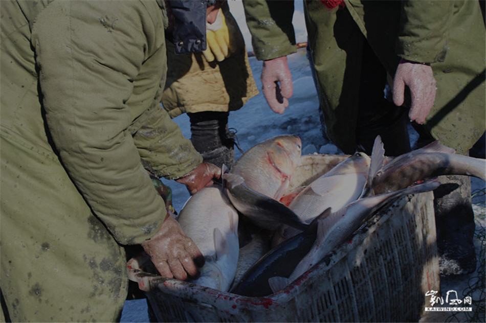 捕鱼场面十分壮观。冰面上被皑皑白雪覆盖着,两台“大胶轮”拖拉机隆隆作响,20余人正在为打凿冰眼而紧张地忙碌着……在寒冷的冬季捕鱼,别有情趣,吸引很多人前来观看。渔人们从早上7点钟开始下网,在大约600米的距离以内,从起点下网,在终点收网。每隔30米远就要凿开一个冰眼,由拖拉机拖拽水下的渔网向终点方向行进,经过3个多小时的紧张奋战,终于在10点30分开始最后起网了。伴随着拖拉机的轰鸣声,近千米的渔网从终点冰眼中徐徐拽上冰面,人们都在焦急的等待着出鱼的精彩瞬间。一开始,渔网中出现了一些大蛤蜊,看热闹的人们纷纷捡起蛤蜊装进袋子里,直到最后,一条大鱼从冰眼的水中跃出,随后很多大鱼在水中活蹦乱跳,“鱼跃龙门”的喜人景象顿时呈现在人们的眼前,大家都十分惊喜地欢呼起来。最大的几条鲤鱼和鲢鱼重达十七八斤,人们纷纷抱着大鱼开心地笑着拍照留影。人们从水中把鱼捞上来,装入筐里,再抬上车运回岸上,早已等候在岸边的顾客纷纷抢购一空。这一网,真是喜获丰收,共收获5000多斤鱼。