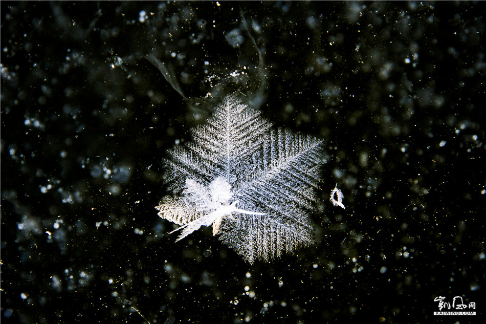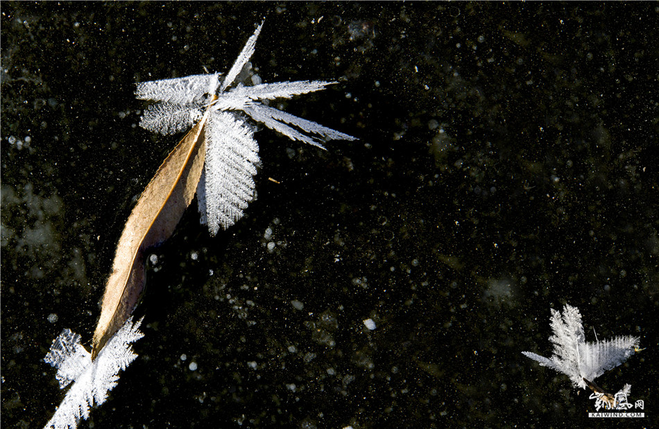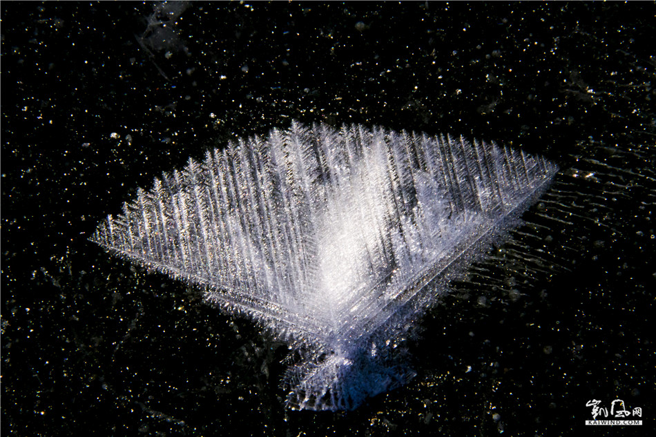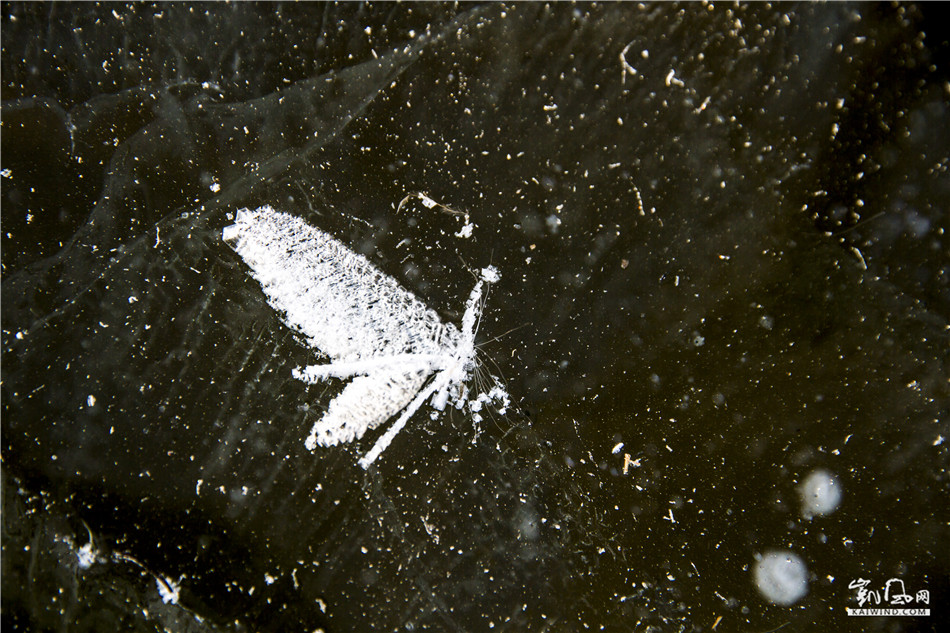 北大荒的初冬,冰封江河,天寒地动,气温常常是冷冷暖暖交替下降,当天气晴朗气温回暖,阳光照在江河湖面上便生成了淡淡的雾气,夜幕降临冷却的雾滴便在透明冰层表面凝华,生成一种美丽的结晶体,镶嵌在冰面上,故称冰花,冰花的结晶体都是有规律的六角形,所以古人有“草木之花多五出,度雪花六出”的说法。冰花一束束,一朵朵,一片片,洁白,晶莹,有的好似茂密的森林,有的像参天的大树,有的像飘落的枫叶,有的像柔嫩的小草,有的像绽放的花朵,有的像展翅的雄鹰,有的像纷飞的蝴蝶,形形色色千姿百态。