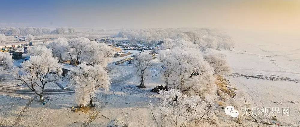 登上观察哨的楼顶鸟瞰,整个世界银白一片,远处的群山时隐时现,升腾的晨雾像条条洁白的哈达萦绕在崇山峻岭间,眼前的松柞槐柳也只能隐隐约约看到其灰色的树干,而且只有细细的一条,早已失去了往日的粗壮。棵棵白桦晶莹玉洁,树干和结满霜花枝杈浑然一体,好似把把银剑直插云天。杨树枝头的冬青结出了粒粒红豆在霜雾的衬托下还清晰可见,“青杨结果果红艳,白桦银花花冲天”是对这场景的集中描述。几栋别墅小楼散落在江畔的树丛中,被整个白色衬托,不时有江雾飘过,只有颜色鲜艳的屋顶若隐若现,真正让人感受到身处人间仙境、世外桃源。执勤哨兵的棉帽、眼眉、胡茬也都挂满了霜花,像个圣诞老人,伫立在哨位上,警惕的双眼凝视着界江的变化,履行着边防军人的神圣使命。最漂亮的还是堤下的排排垂柳,银花满身,粗壮挺拔,像一排排银盔玉甲的士兵,肩并肩、手挽手,筑起一道银色长城,抗击寒流。所以又有“江畔红柳柳似银,北疆雾凇凇如神”之赞美。