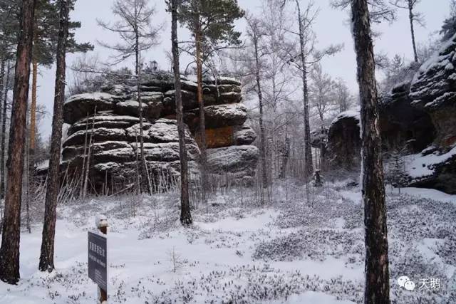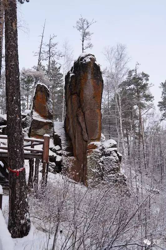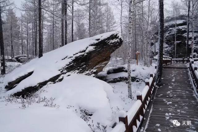 那是落满奇石的山巅。人们叫它苍山。驱车沿着平坦的山道盘旋而上,便是苍山的那片开阔地,从这拾阶而上便登上了那片山巅。这山巅广阔别有洞天,几千米的方圆里落满了奇异之石,造型惟妙惟肖,但见那巨石庞大各式各样,有方,有长,有圆,有扁,有立,有卧,石表光滑,其润如玉,石中还有珍稀的古先民岩画,尽显古朴沧桑。那位镇长说,这巨石皆属角宁砾石,是几亿年前火山岩浆喷发留下的产物,是伊勒呼里山脉最古老的东西,如今它成了呼中一大景观,那名字是这景观的最好诠释,“鹰嘴石”、“增寿龟”、“西海巨鳌”、“金蟾望月”,“一线天”,叫得贴切悦耳,尤其是“北国一柱”名好听石诱人,它只身头顶巨石傲然而立,好一幅鬼斧神工下的天然意象,奇异至极令人称绝。走在这山上山下悠长蜿蜒的木栈道上,既可赏石,还可赏松赏山赏雪,赏那满山遍野的雾凇与树挂,那种感觉犹同置身一片片珊瑚林里,让人彻底领略了这最冷呼中的美轮美奂。