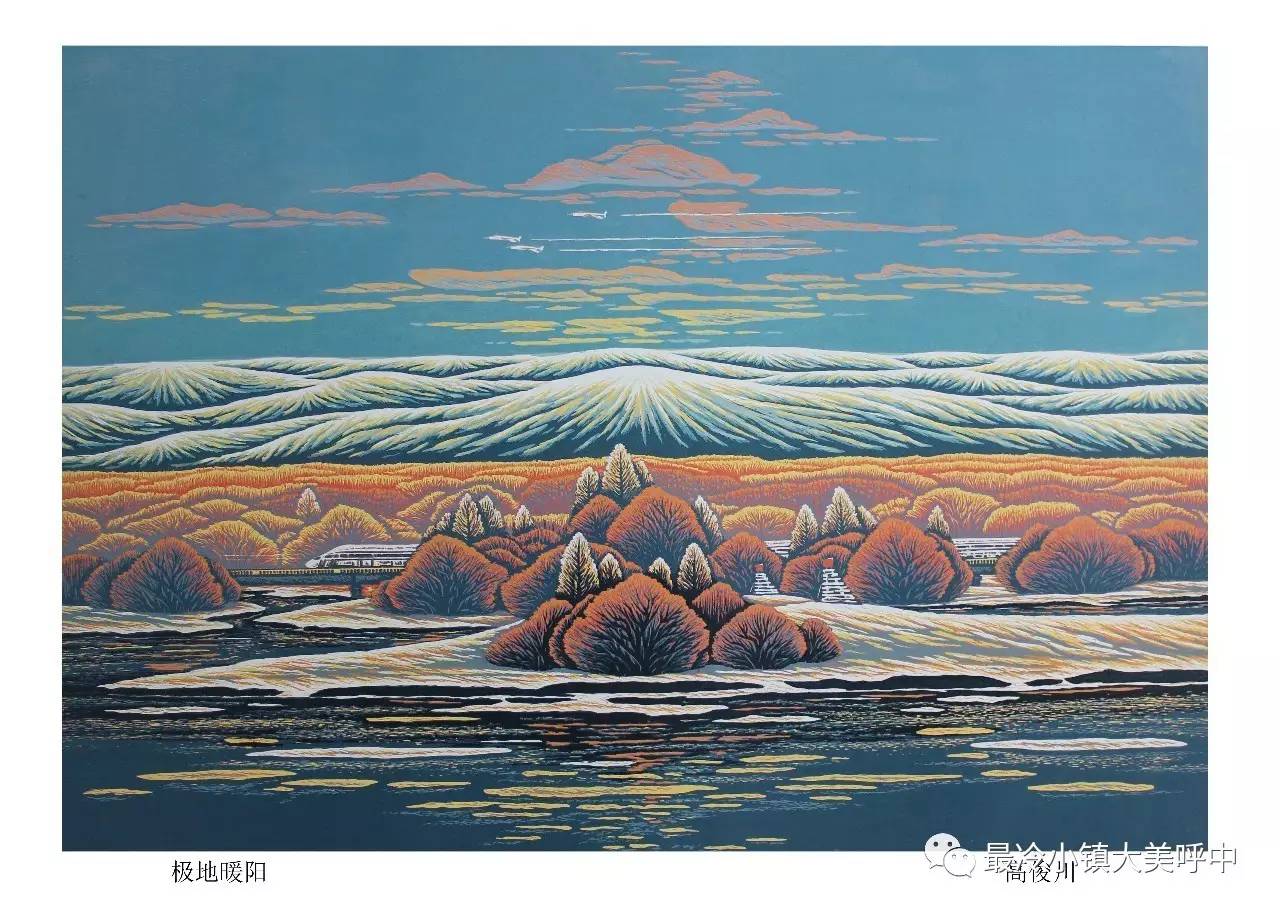 高俊川的作品之所以能给人如此美妙的感觉,犹如置身于舒适的大自然,使人整个身心会得到彻底放松。这与他生活的环境息息相关。“ 中国最冷小镇 ” 秀美的自然景观启迪了高俊川镌刻的灵感,开阔了他的视野,家乡的一草一木,一山一水都是他画中的主角。都能牵动他敏感的神经,源源不断地激发他创作出一幅幅灵动的自然写意,饱含家乡深情的画作。穹顶之下的大白山,浩瀚无际的原始森林,尽情奔跑的驯鹿,色彩斑斓的五花山,银装素裹雾凇美景,从高俊川的刻刀流泻而出,倾诉着他对家乡的深深眷恋和崇敬之情,化作色彩的版画,传递着浓浓的乡情,宣传着家乡的生态美景和文化。
