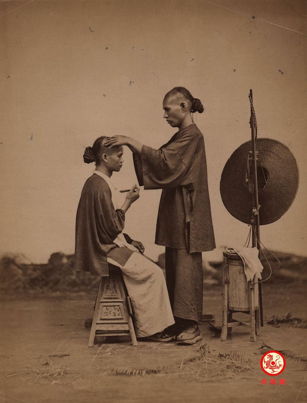剃头匠,1870年代,蛋白照片,尺寸27×20cm。晚清时代,一方面普通百姓难以接受摄影术,另一方面,当时拍照的价格比较贵,只有少数富裕或精英阶层才能消费得起。富贵人物会主动地邀请摄影师来拍摄或亲自前往照相馆拍摄肖像。
