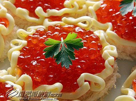 鲜美可口的鱼子酱,分为红鱼子酱(красная)、鲑鱼子酱(икра лососи)、黑鱼子酱(черная)、鲟鱼子酱(икра остра)。红鱼子酱常被做成沙粒。