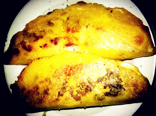 把从地里刚剥回来的疙瘩菜叶儿洗净、沥水、展开,再将稠糊糊的浆粑摊饼子一样铺到绿绿的疙瘩菜叶儿上,舀一勺洋芋丝、豆腐或者鸡蛋、韭菜、肉馅儿均匀铺在浆粑上,还可依个人口味、依馅的品种放点青红辣椒,最后对称的合上叶子,很像外面卖的大号的荷叶馍,合拢,捏好边缘,然后放在铁锅里烙,火候的大小要合适,而且要有专人站在灶台边来回地给翻个,20分钟左右,浆粑角儿熟了,香气四溢。