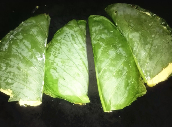 我们常用来做浆粑角儿的叶子,便是还没完全卷住的疙瘩菜叶儿,城市人叫莲花白,农家地里自己种下天然生长的又圆又大,油光柔韧。