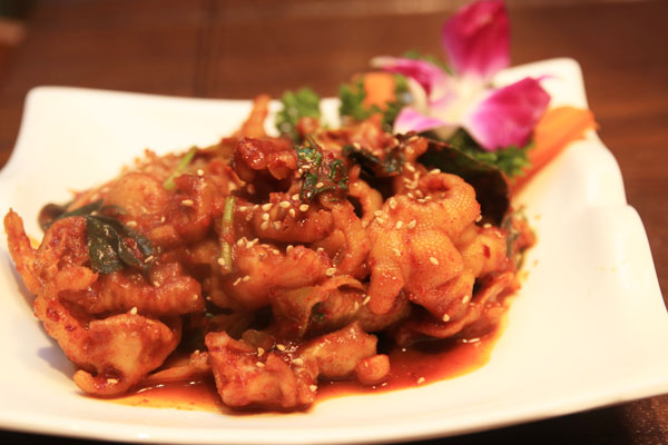 他家厨师是在韩国聘请的多年经验大厨,让你可以不出国门品尝到正宗的韩式美食,蘸料上有干料和酱料,酱料有两款。同时每桌还提供四个压座小菜。说到烤肉,店家近期新出品了几款肉类,调味牛排和调味猪排,肉类经过调味后,味道更加浓郁,放在烤炉上吱吱作响,味道扑鼻而来,烤好后的肉卷上一片生菜,配上店内的蘸料,一口下去肉质软嫩,唇齿留香。新品猪包肉,简直是懒癌患者的福音,可以不用动手烤制包裹着菜叶直接食用。
