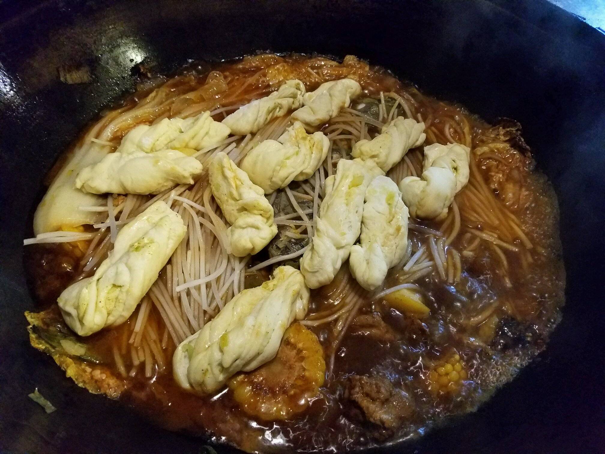 服务员把食材准备好,就开始现场制作,简单炒制后,就把这些东西按照顺序倒近锅里,开始炖,每桌会赠送鸡蛋焖子一份,其实还可以在锅上面蒸一点东西,配这个焖子,好吃。炖锅这个过程必须要耐心等待了。花卷在炖的快好的时候,服务员会下里边。大概20分钟左右,香喷喷的锅就可以吃了,小花卷在最上面,还有着排骨的锅汤汁的味道。