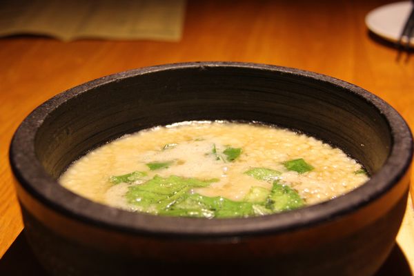 标注了三个星号的火焰虾必须尝一下,虾都包在锡纸里,现场点火,画面很唯美还很帅气(没吃过的请自觉补脑),1分钟后火灭了虾就完全熟透,微辣的口感给100个赞,连虾皮都可以一起吃掉。由海鲜熬制的石锅沸饭30元一份,端上来的时候还在咕嘟咕嘟的,鱼片、海米、油麦菜的绝妙组合,趁热吃十分有味道,就是吃的时候别心急,小心烫到嘴。