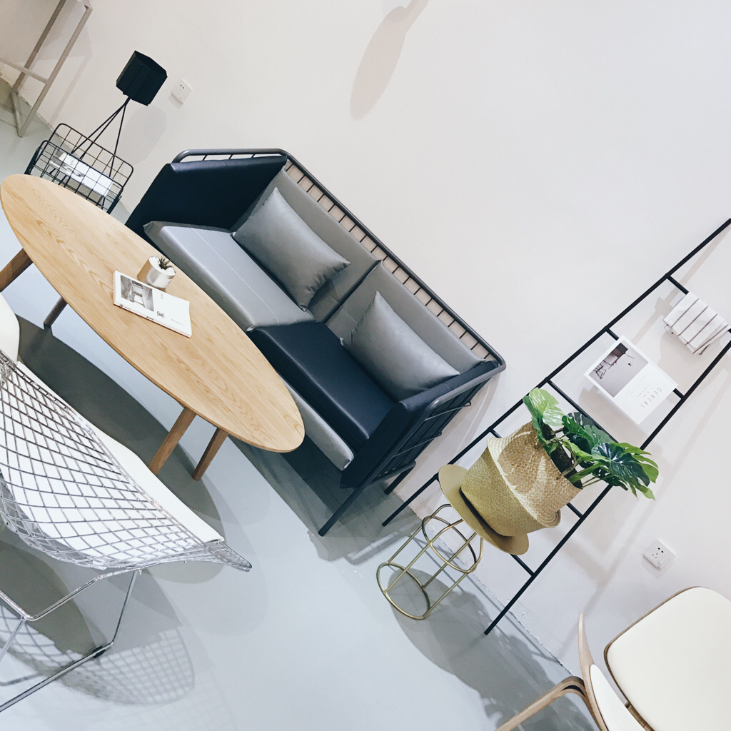 走进店内二楼开始欣赏室内的极简主义风格,简约中带着小清新,让人感觉恬静、有趣。以桌椅形态不同划分区域间隔,软装搭配的桌椅摆放也别有心思,shellchair三角贝壳椅和钻石椅我非常喜欢!都是国外大师经典之作!有美感的吊灯、极具艺术感的陈列!有原创设计,餐具、香氛售卖物品,零散而有序地分布着,为整个视觉空间增添了宁静的文艺气息。