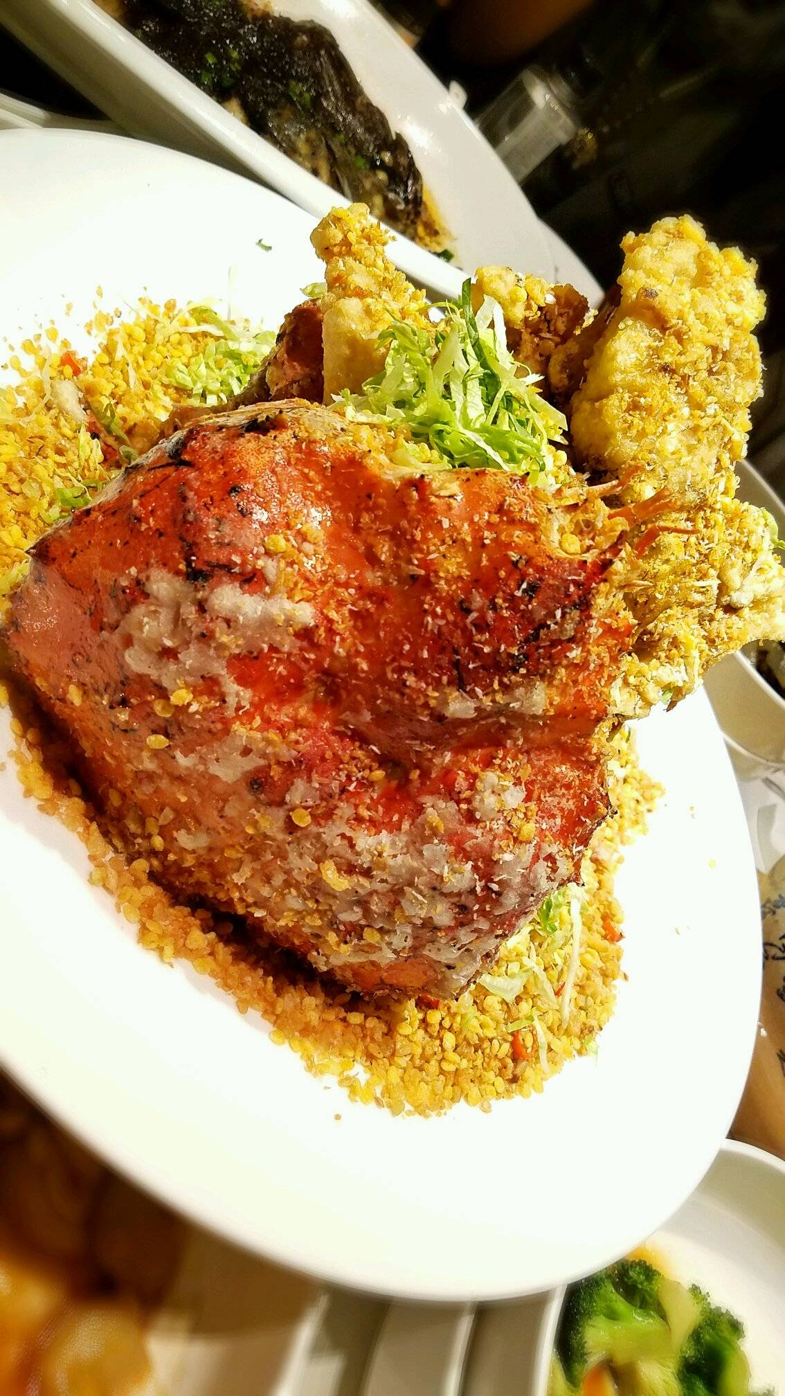 龙虾是两种做法,一种是刺身,当龙虾还活着的时候给它片了,之后切小段儿,配上柠檬汁和辣根吃,龙虾肉晶莹剔透,似乎透着光亮,雪白得如羊脂玉一般,吃起来Q弹筋道儿,还有一丝丝甜味儿,就是看着龙虾还活着,嘴巴一动一动的,感觉好残忍啊!等待刺身吃完后,龙虾剩余部分被拿去做蛋黄焗龙虾,全部是用上好的蛋黄,吃着那叫一个香,胆固醇高的人就少吃点儿吧~