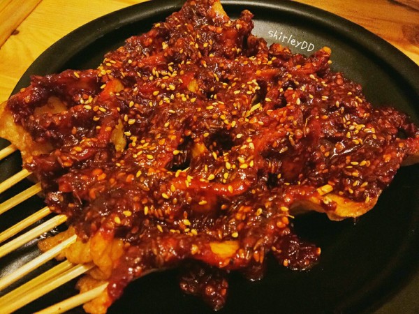 店铺是典型的延吉风情装修,二楼有几张榻榻米,习惯了中式饭桌的你,也可以来尝试一次所谓的“席地而坐”。不用担心天气寒冷,榻榻米旁的暖气可是开的足足的。麻辣牛肉条是极力推荐的菜品,不会过分的辣,有一丝回甜,吃起来很有嚼劲!喜欢喝酒的小伙伴,千万不要错过这道美味的下酒菜!鸡爪做的非常软烂,店里给配了一次性手套,抓起来吃也很方便。麻辣排骨和鱼饼串味道相像,酱料是很重的辣酱,好吃到要冒着嘴肿的风险,也不想放下筷子!
