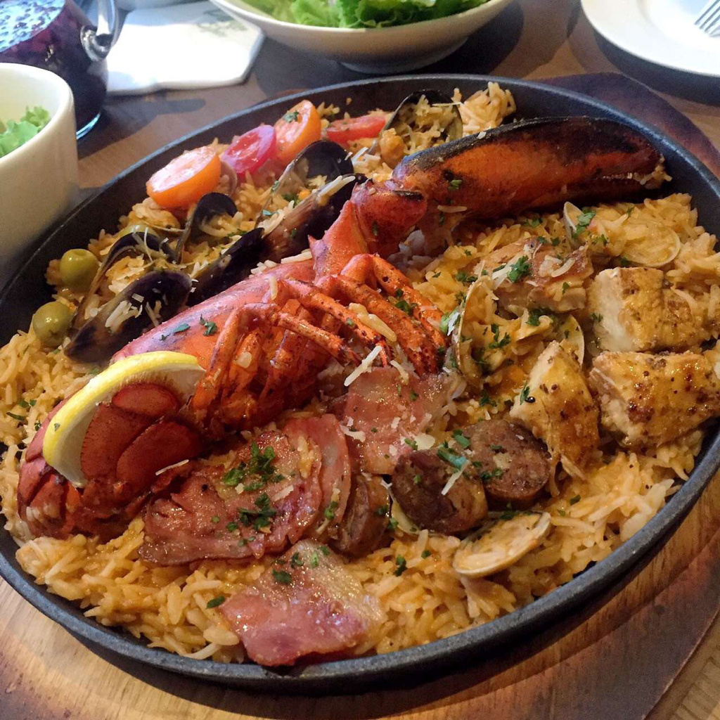 第一次来的时候服务人员帮我们介绍了几款头牌,后来又来过一次,那就综合在一起也让大家多看看,好琢磨琢磨你们来点什么!哈哈哈~是不是很贴心!首当其冲要说的当然是他家的“皇家龙虾海陆空海鲜饭”,怎么样,这名字是不是相当霸气,而且菜单上的卖相也相当好,大概扫了一眼,基本上桌桌都有点。等它一上来,我真心觉得点对了,和菜单上基本是符的上的,半只龙虾口感十分新鲜,米饭底不是咱们平时家里吃的米,有点像泰国香米长粒的,但口感稍稍有点硬,有点煲仔饭那种感觉。上面铺着海虹,橄榄,肠还有一些配菜,一口下去,每一粒米饭都裹着酱汁很满足啊,这绝对是他家的豪华主食!还点了一个汉堡吃,“魔鬼汉堡”看着也造型满分,但看着就感觉会很辣,我没有吃,不过看朋友吃的也是很香,应该会不错。