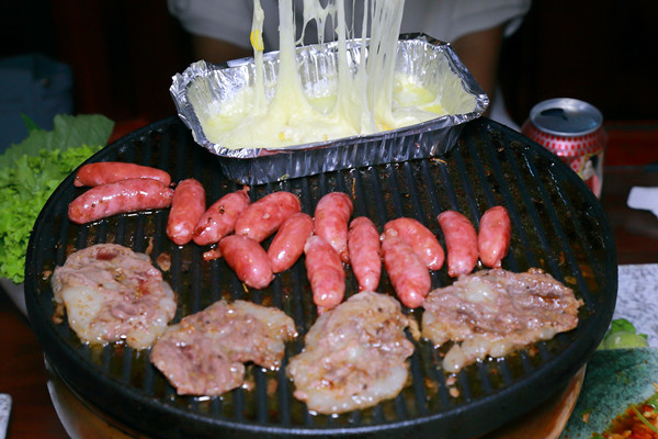 蘸料又是店里的一大特色,酱料有两种,一种是生菜酱略咸,另一种是辣椒酱,都是店里主厨精心研制的,每桌还配有两种粉料,海盐和现磨黑胡椒,还有海鲜汁可供选择。多种蘸料都体现这老板的细心与用心。烤菠萝和芝士烤肠是店里点单率最高的两种菜品,烤菠萝采用进口的菠萝,厚切,当用剪子剪开的那一瞬间菠萝香气四溢,空气中弥漫着阵阵甜味,烤完的菠萝香脆可口,当咬开的一刹那,菠萝的汁水会在口腔中爆开,就像炎热的夏日刮过的一阵凉风,解腻爽口。芝士烤肠,采用韩式烤肠裹上香甜的芝士,那味道真的是没得挑。店里还有另一道解腻神器,就是麻酱油麦菜,新鲜的油麦菜被黄瓜条包裹起来,沾着咸香的麻酱,甘脆爽口,其味无穷。蔬菜和凉菜种类繁多,荤素搭配且不至于吃得太过油腻。在整个烤制过程都无需食客们亲自动手全程有老板或者店员操作。店里的酒类很接地气,一口酒一口肉,觥筹交错,酣畅而淋漓尽致。