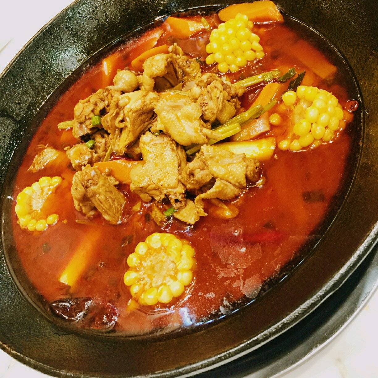 开锅继续加热煮了下,味道出来了,里面的汤料味道开始扑鼻~那根沙参好大颗,在里面翻滚~里面有玉米和胡萝卜配菜,也可以加其他的刷品。 很大一锅,俩个人吃,所以没加菜菜~ 多煮一会的鸡锅明显好吃了,鸡肉没有汤美味啊`对于我来说还是有些辣,汤很好喝。
