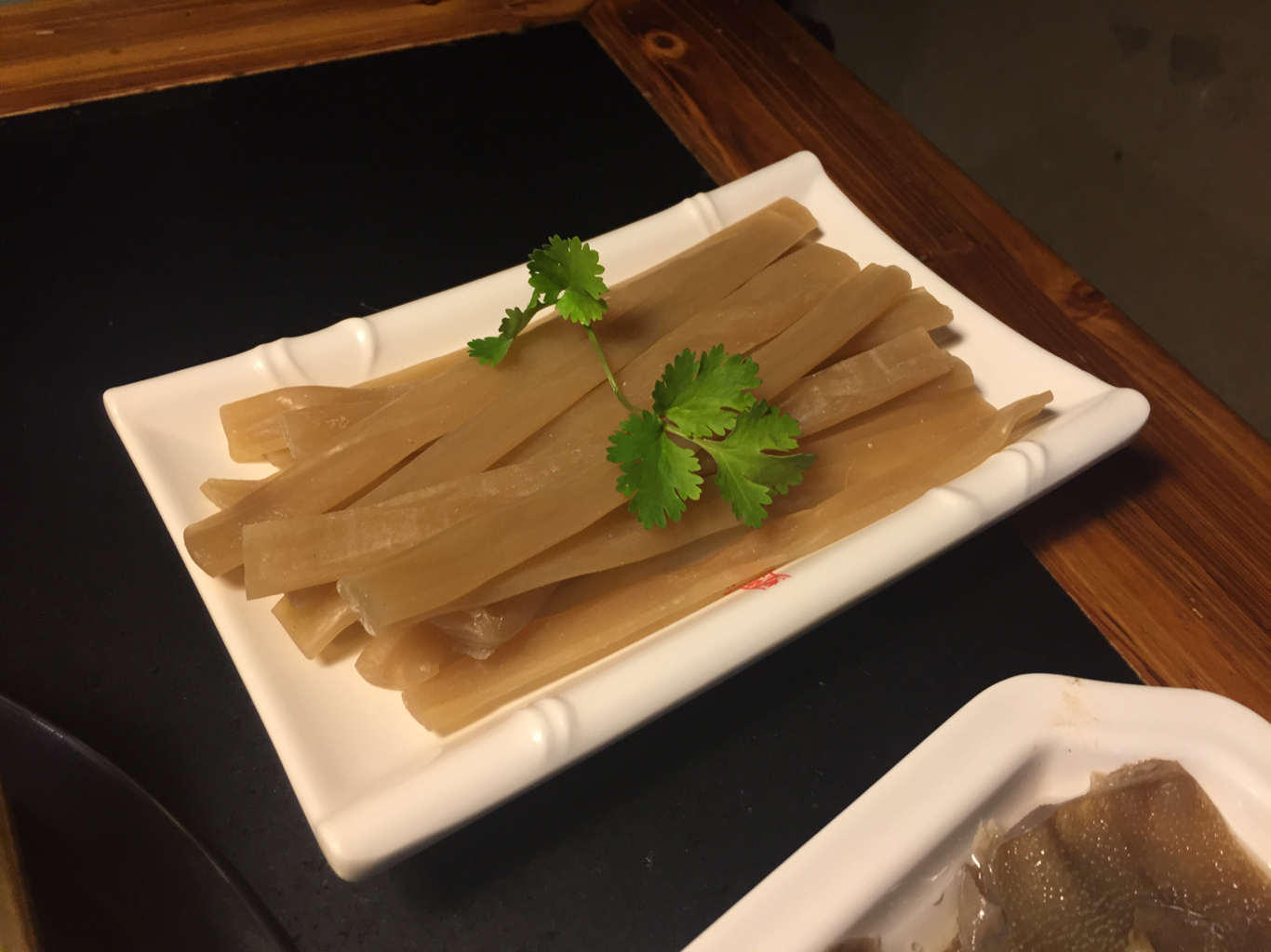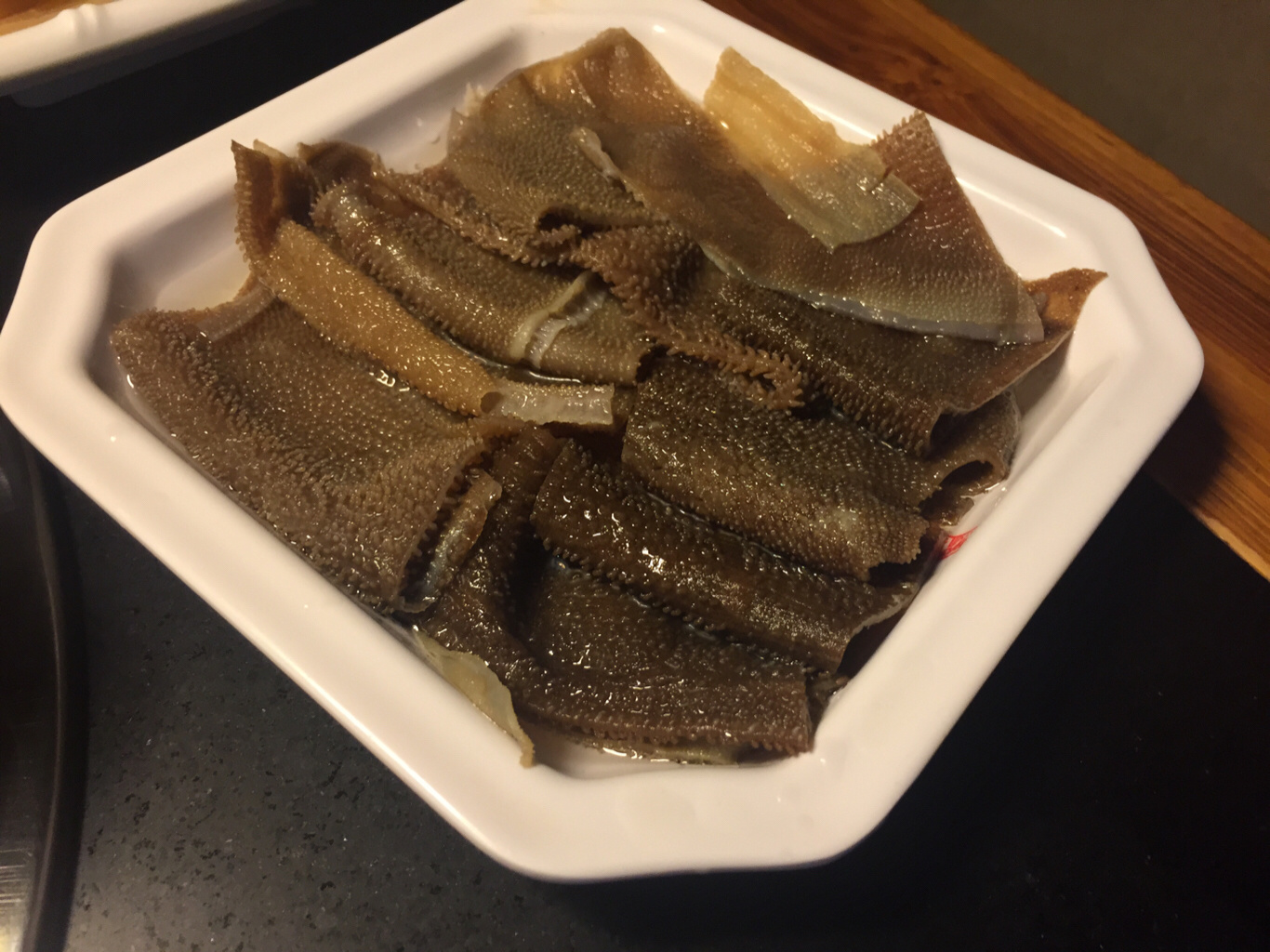 接下家就是毛肚,点的是浸在油里的黑毛肚,在锅里涮15分钟就可以吃了,口感一级棒!不硬,反而是有点脆脆的,头一次发觉毛肚原来这么好吃~