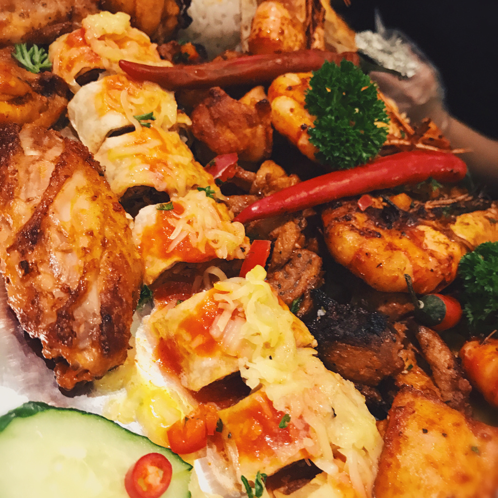 多彩缤纷里面有牛肉大串、羊肉大串和鸡腿肉串、烤羊腿、烤鸡翅、烤大虾、各种酱料、主食等等。
