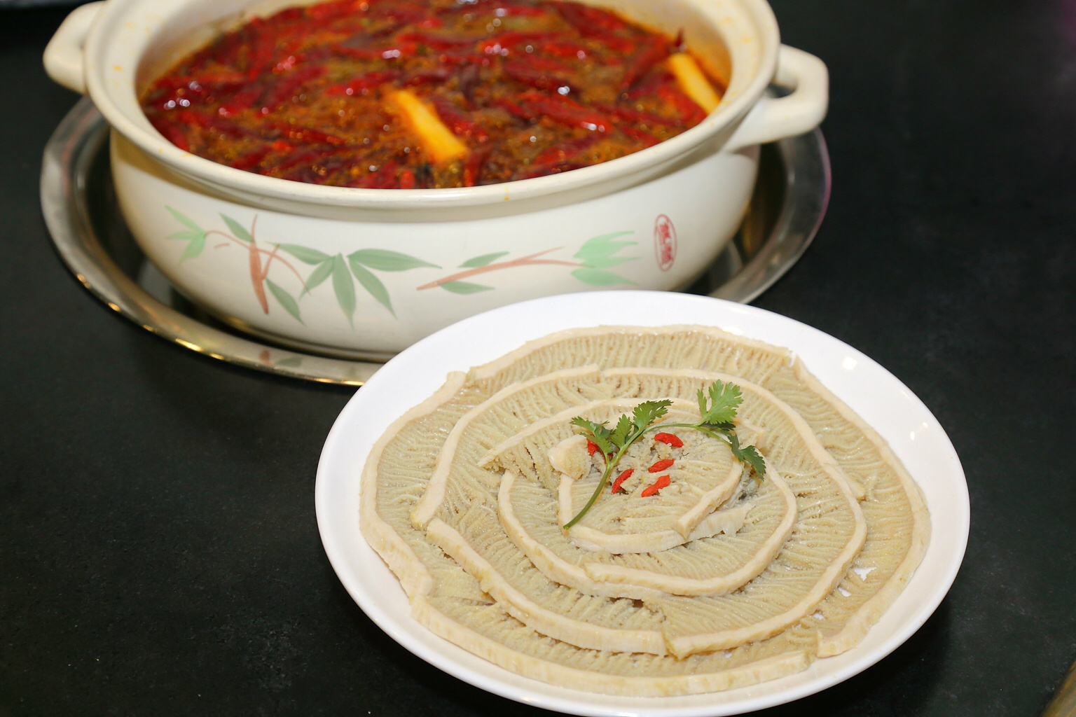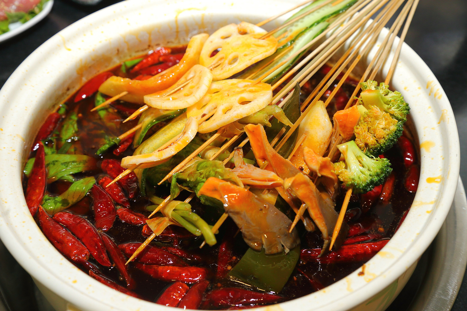 作为正宗的成都串串,店家的锅底分为三个辣度,休闲模式、挑战模式还有传说模式,作为东北人的口味休闲模式更为适合,很能吃辣的人可以选挑战模式,传说模式还未有人尝试过。锅底刚上来的时候没有什么味道,随着火候的加热,味道越来越香。推荐极品千层肚,店家自制,每天限量5盘,看颜色就知道与外面碱发千层肚的区别,吃到嘴里的都是满满的胶原蛋白。泡椒牛肉和小滑肉也是必点特色,肉质鲜嫩口感好。