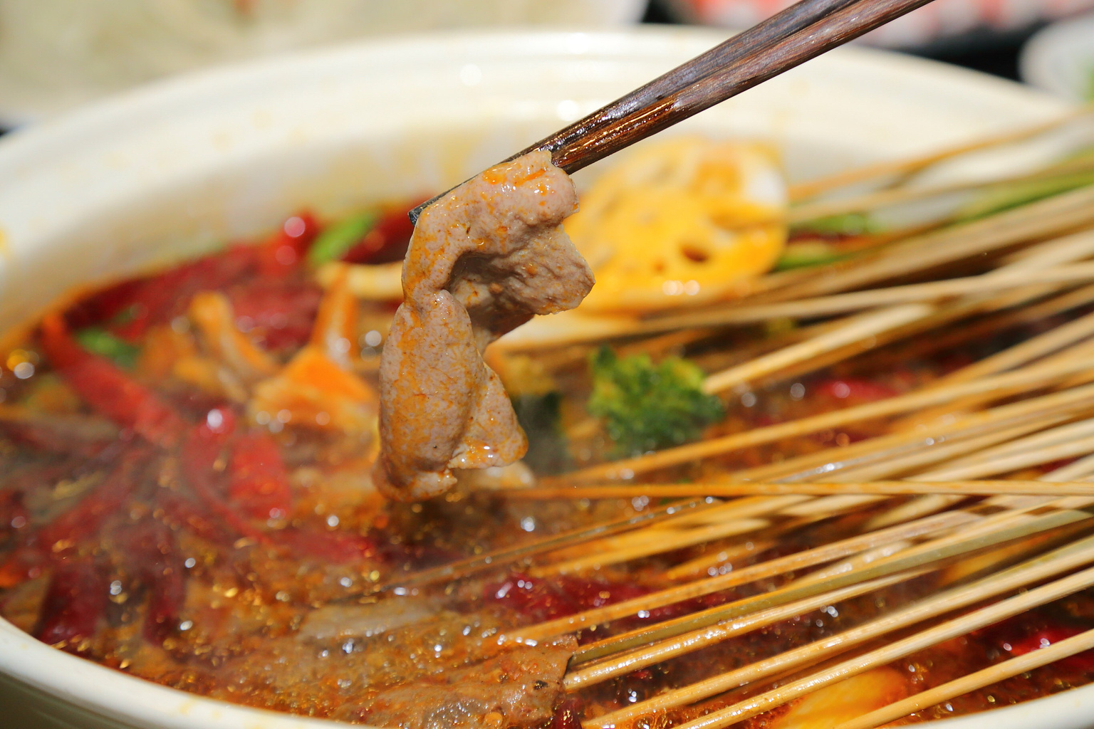 牛肝也是店家另一招牌,涮十几秒之后很大一片,弹嫩可口,别家串串香没有的特色。皮蛋豆花配着花生粉和辣椒油一起入口最佳,吃成都串串一定少不了酸角汁,风靡成都的云南特色酸角汁和芒果汁在哈尔滨只有这家店有哦,酸甜爽口,解辣必备。