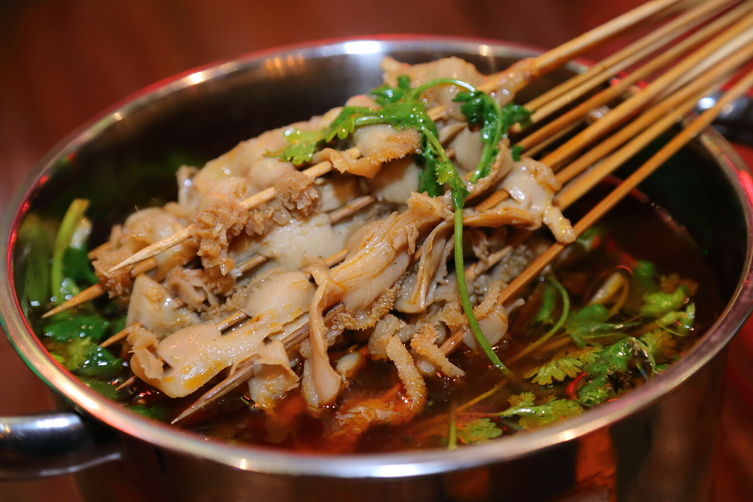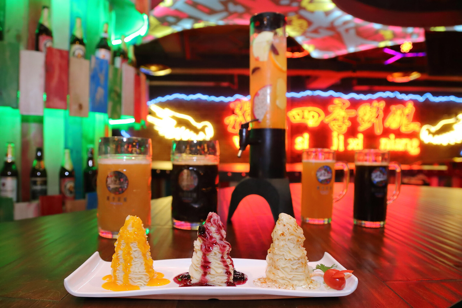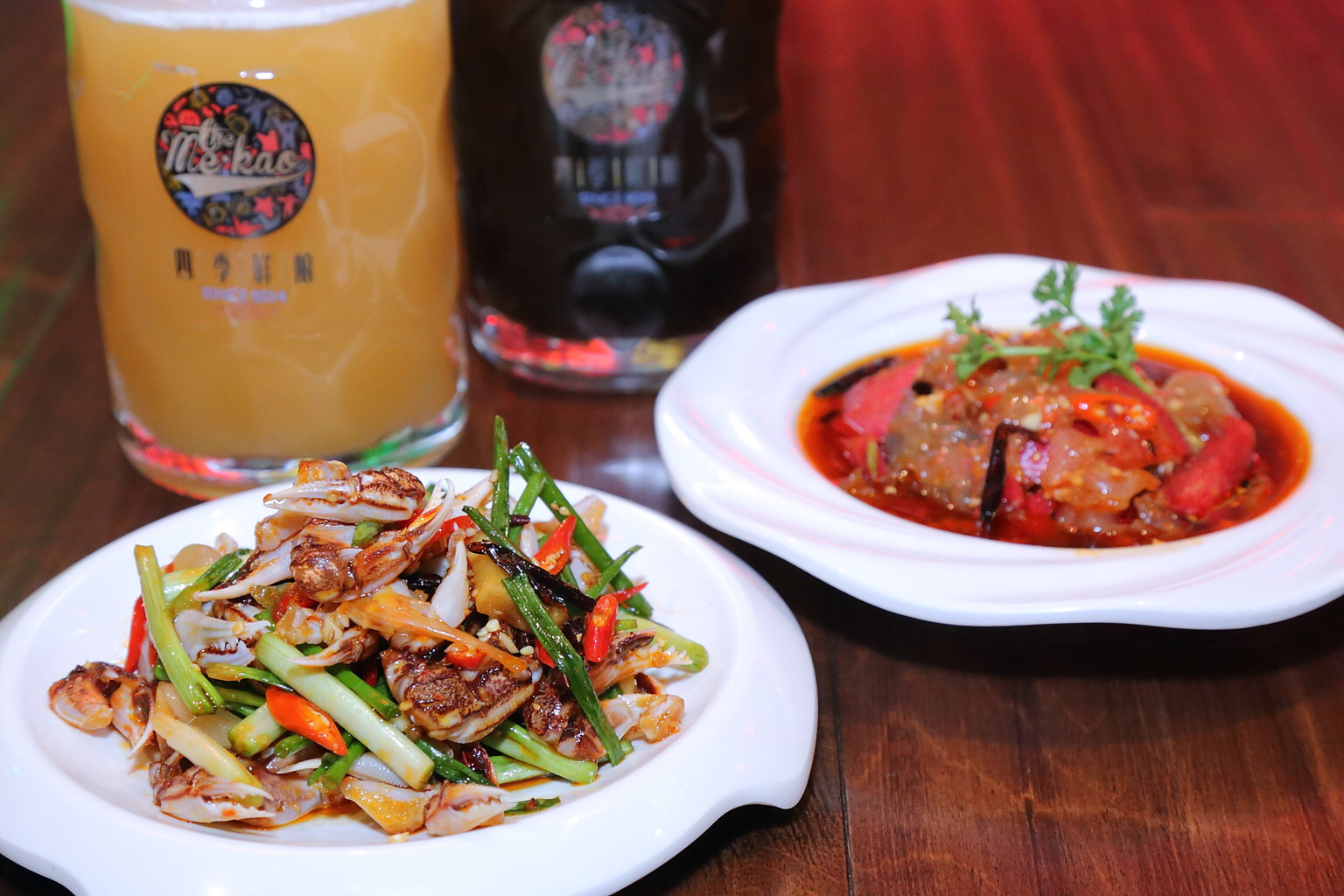 店内的自酿啤酒主要有三种,小麦啤酒具有浓郁的脂香味,类似果香,入口厚,回口微甜,非常适合女生饮用。其泡沫洁白细腻,持久挂杯,观赏起来不觉赏心悦目。大麦啤酒散发着浓厚的大麦芽香味和酒花香味,酒体微黄、淡爽宜人。黑啤以大麦芽、焦香麦芽和黑麦芽共同酿造而成,入口焦香味十足,有类似咖啡醇苦气息,别具风味。除了自酿啤酒,来店里最应该尝一尝的还有特色毛肚锅。店内的毛肚锅采用独家秘制配方,摒弃了大部分毛肚锅底的油腻,既美味又健康,连怀孕的老板娘都一锅一锅的吃,你还有什么不放心的呢?