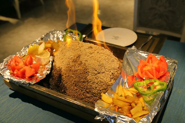 穆光土耳其餐厅的装修充满了伊斯兰风格,拱形的装饰透露着古典而神秘的气息。深蓝色的桌布与白色的座椅相辉映,让食客们不觉沉浸在爱琴海岸蓝白相间的梦幻遐想中。伊斯梅尔就是位于爱琴海岸的土耳其第三大城市,同时是第二大港口。那里最有名的美食就要属伊斯梅尔烤鱼和烤鸡了。伊斯梅尔盐烤鸡以厚厚海盐包裹着鲜嫩的整鸡,在鸡肚子里还加入黄油炒过的香甜米饭,经过三至四小时的精心烤制,最终以火焰盐烤鸡的形式呈现在食客们面前。鸡肉烤过后水分基本烤干,鸡肉劲道有嚼劲,鸡皮完全没有油脂,非常焦脆,别具风味。