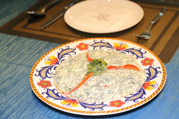 茄子是土耳其最重要的蔬菜,简简单单的一根茄子在土耳其有上百种做法。卡尔斯番茄牛羊肉以茄子为底,上面铺满调过味的牛羊肉馅,柿子与茄子的完美搭配的也使牛羊肉馅更加具有异国风味。阿纳多卢茄子表面看起来像是两堆茄子中间夹着一碗米饭的全素搭配,其实轻轻拨开一条条茄子,就会发现里面竟然是扎实的混合肉馅,精致的料理令人惊叹。这一做法完好地保留了肉类本质的味道,汤汁饱满的肉馅块有着外脆里嫩迷人口感,秘制的番茄浓缩酱更是将整道菜的风味完美升级,让食客们尽情地享受肉香四溢的味觉盛宴。土耳其妈妈菜以秘制酸奶和菠菜混合制成,奇妙的口味让食客们耳目一新。