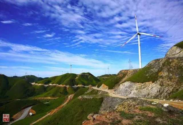 在广西龙胜各族自治县南山拍摄的风力发电机组(2017年5月17日摄)。广西龙胜各族自治县南山海拔1600米左右,风力资源丰富,已有大小风电场11个,为当地带来旅游景观和新能源的双重效益。新华社发(黄勇丹摄)