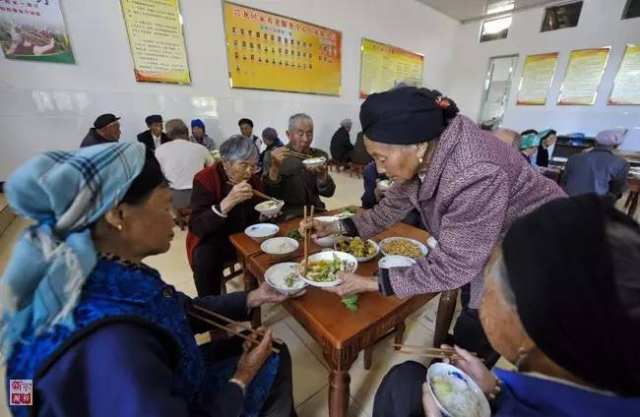 在云南省曲靖市麒麟区三宝街道兴龙村,老人们在养老服务点就餐(2016年6月1日摄)。新华社记者周磊摄