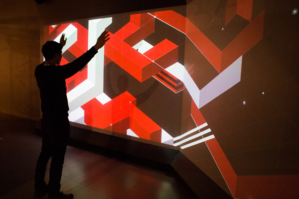 观众走进展厅入口即进入高科技感应区,数字大屏幕上不断变化的几何色块用舞动的方式回应每一个人身体的运动;机器人是一个必然的亮相——科技界对魔方机器人的研发自魔方问世后就开始了,此次展览所展示的机器人不仅可以破解任何魔方,还能模拟人的动态,时而停下思考,时而表达感谢与骄傲。创下吉尼斯记录的“全球最大魔方”,高达3.5米,重达2.1吨,可以通过一个小魔方手柄实现灵活操控。普通的魔方是通过外部驱动,而巨型魔方则是内部驱动,这等于是开拓一个未知的工程领域。