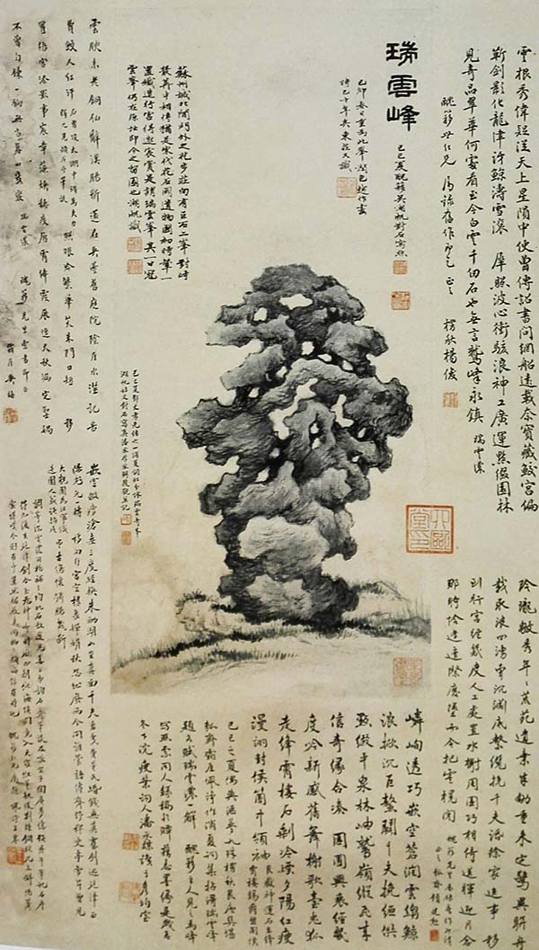 值得一提的是,在1843年上海开埠之前,松江曾经是上海地区的政治、经济与文化中心,是上海历史文化的发祥地,目前是上海地面文物最为丰富的地区,也是上海古代赏石文化的渊源所在。松江地区文化底蕴深厚,历代名人辈出,元明以来有关赏石文化活动的文献和实物也是层出不穷。如元代至正年间,史学家、文学家陶宗仪曾经从浙江挈家到泗泾镇隐居几十年,在泗水之南构筑“南村草堂”。其所着的《南村辍耕录》(亦名《辍耕录》),留下了许多有关赏石文化的珍贵史料,如《宝晋斋研山图》首次绘录了南唐李后主的那方后来归米芾收藏的灵璧石砚山,成为赏石文化史上重要的图像佐证。陶宗仪还将前人的笔记、小说辑录为《说郛》(100卷)传世,其中《渔阳公石谱》就在其列,这也是所谓米芾四字“相石法”的最早出处所在。