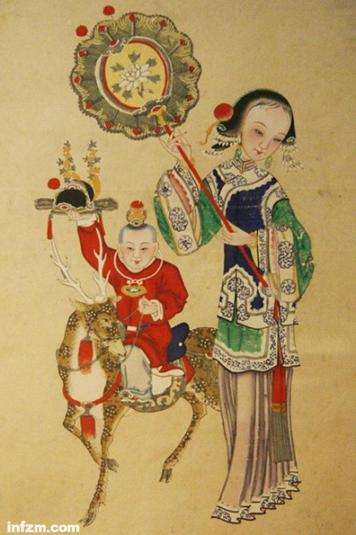 国人讲究“意头”,小小年纪也要惦记着功成名就,骑鹿(禄)而行。(南方周末资料图/图)