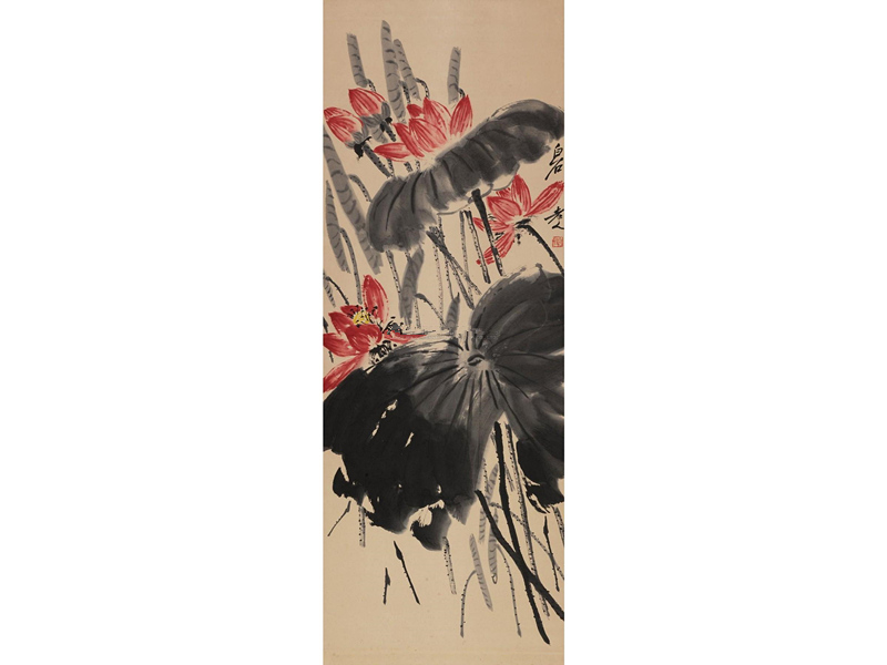 中国画家爱画荷花,远的有明末清初的八大山人和恽寿平,近代的中国画大师吴昌硕、齐白石、张大千、潘天寿、刘海粟、李苦禅、石鲁等,都是画荷花的妙手。八大山人的荷花残败荒凉,恽寿平的荷花工笔规整,吴昌硕的荷花金石味浓,齐白石的荷花豪放大气,张大千的荷花婀娜多姿,潘天寿的荷花刚健挺拔,刘海粟的荷花泼彩浓艳,李苦禅的荷花铁笔酣畅,石鲁的荷花夸张简练,每个人都对荷花有自己的刻画和解释。但若论最奔放写意,淋漓痛快,则非齐白石的荷花莫属。齐白石画的荷花也是经历了一个由简到繁的过程,晚年的荷花墨色淋漓,色彩艳丽,穿插繁密,笔势豪放,将荷花的写意描绘推高到一个新的境界。