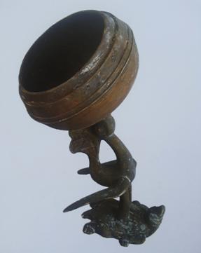 海昏侯墓出土的熏炉,造型十分奇特。它的底座是一只昂起头的玄武(神龟),上面踏着一只展翅欲飞的朱雀(神鸟)。四神之中占有两神,因而定名为双神青铜熏炉(图11)。而在朱雀的头上顶着敞口的熏炉,略微倾斜。从炉身上的三道玄纹判断,原来可能有镂空的炉盖,可惜已经缺失。这件熏炉比起博山炉体积要大得多,容量也大得多,由此判断使用时将草木类的香料直接放入炉中点燃,待产生烟味与香味的混合体后,再用于熏蚊、熏虫、熏衣、熏被等。