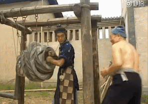 相比之下,电视剧《寻秦记》中出现的橐龠就更加形象生动了,不过这应该只是一个简化版的,去掉了传动工具桔槔,单人驱动,供小型冶铁作坊使用: