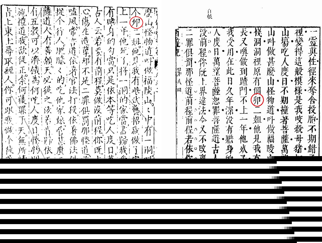 更有一些说法,把卯二姐说成了卵二姐。那这个小度就要好好纠正下了。《西游记》现存最早也最重要的刻本是明代万历年间的《世德堂本》,上面清晰可见明明是刻的“卯二姐”。而另一个重要刻本,崇祯年间的《李评本》上面也是“卯二姐”,所以说猪八戒的妻子就是卯二姐,而非“卵二姐”。