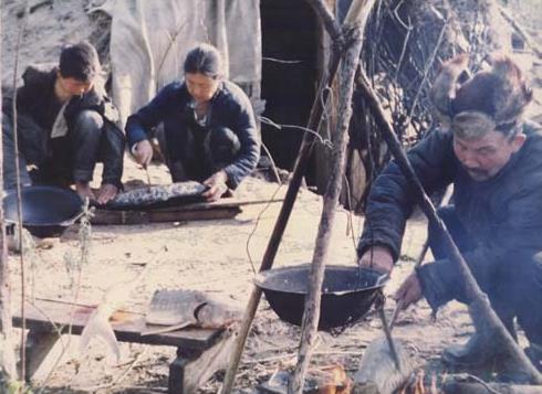 赫哲人生活在中国大陆的最东端,那里山高林密、河汊纵横,为赫哲人久已习惯的渔猎生活提供了便利的自然条件。民间谚语所说的“棒打狍子瓢舀鱼,野鸡飞到饭锅里”,就是对赫哲人浪漫而又真实的生活环境的生动描绘。沿江而居的赫哲人在渔业生产中积累了丰富的捕鱼经验,练就了高超的捕鱼技术。赫哲人捕鱼的主要工具是叉、钩、网三种。更令人叫绝的是,赫哲人还创造了冰封江面时的干钩钓鱼法。这是一种在江面上凿冰捕鱼的方法,赫哲族的男女老幼都十分喜爱并精于此道。春天,赫哲人捕捞各种杂鱼;夏天,他们修理渔网、整理渔具;秋天,那可是赫哲人收获的季节,他们尽情地捕捞大马哈鱼、鲟鱼和鳇鱼;到了冬天,他们则凿冰眼、拉大网捕鱼……赫哲人的生活离不开鱼。早年的时候,他们以吃大马哈鱼的次数来计算自己的岁数,吃过几次大马哈鱼就是几岁。连孩子们的游戏也离不开鱼,他们常常玩一种“叉草球”的传统游戏,就是模仿渔业生产中叉鱼的样子追逐嬉戏。