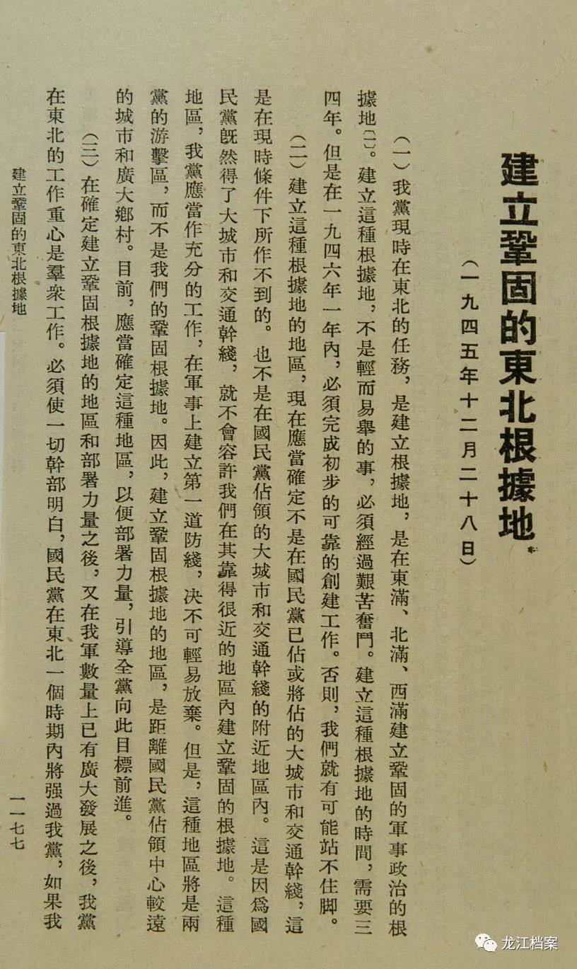 抗战胜利后,东北成为国共两党争夺的焦点。中国共产党领导的东北抗日联军、八路军、新四军先后挺进东北,占领各战略要地。1945年9月,中共中央东北局成立。随后,中央从延安等地派出11万大军和2万干部进入东北。同年12月,中共中央发出了《关于建立巩固的东北根据地的指示》。至此,创建巩固根据地的工作全面展开。