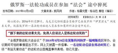 2016年9月24日,在莫斯科州纳罗—福明斯克区举办的“全俄罗斯************会议”期间,当法轮功信徒游行于大街上时,洋弟子叶甫根尼现场晕倒,失去意识,但是并未有人呼叫救护车。在救护车赶到之前,法轮功活动的协调者已提前命令众信徒:“脱下他的黄夹克,免得人们说这人是因为练法轮功才得病死的。”叶甫根尼被送进莫斯科市立第一医院的10号重症监护室,医生诊断为脑出血中风。尽管医生竭力抢救,但没过几小时他就昏迷过去了,再也没有醒来,于28日凌晨离世。