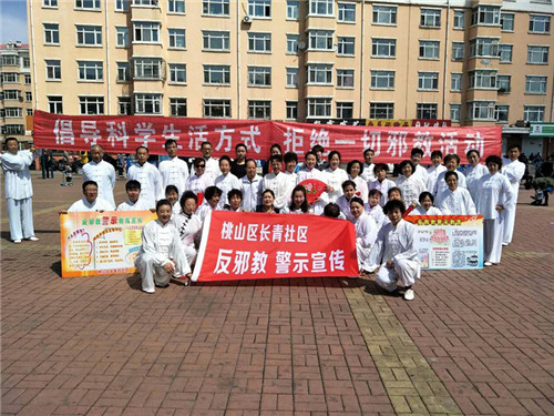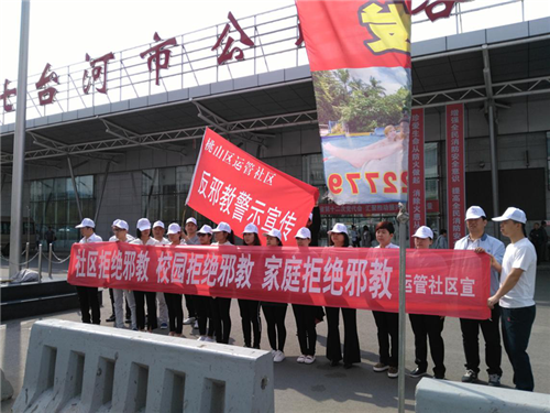 七台河市桃山区各社区结合自身特点,以活动为依托,组建了“广场舞反宣队”、“太极拳反宣队”、“义务巡逻反宣队”、“小红帽”反宣队、“红领巾”反宣队、“快乐义工反宣队”等十余支反邪教宣传队伍,营造了浓厚的反邪、防邪社会氛围,提高了群众自觉识别和防范邪教的能力。